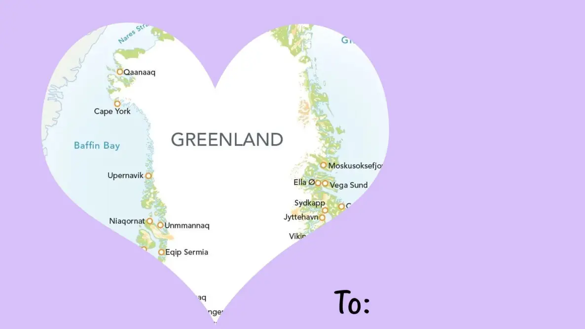 Первая валентинка с теплым посылом посвящена крупнейшему острову мира, интерес к приобретению которого ранее проявлял Дональд Трамп. Надпись на открытке гласила: «Пришло время нам определиться с нашей ситуацией с отношениями».