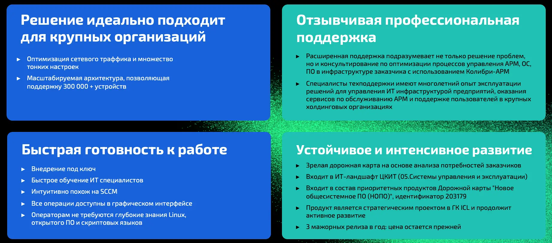 Важным преимуществом современных решений является возможность централизованного управления инфраструктурой, что способствует снижению операционных затрат и позволяет быстро реагировать на любые технологические изменения. Например, внедрение корпоративных центров самообслуживания облегчает поддержку сотрудников, а автоматизация миграции ОС делает запуск новых рабочих мест быстрым и предсказуемым.