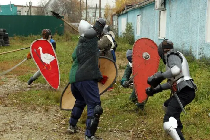 Тут же участники с вдохновением изучают древние технологии изготовления щитов. Каждый щит — уникален и требует идеально точных, «анатомичных» замеров. В коллекции клуба большинство щитов деревянные, с мудро добавленной прорезиненной окантовкой. Это не просто деталь, а проявление заботы о безопасности товарищей по дуэлям.