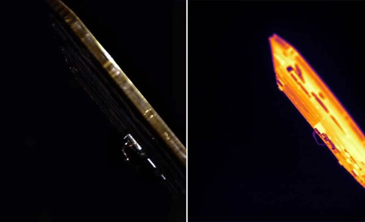 На снимке левее — результат работы камеры видимого диапазона. Правый же кадр сделан инфракрасным сенсором, чётко показывающим температурные зоны: более нагретые и прохладные участки поверхности солнечного крыла аппарата.