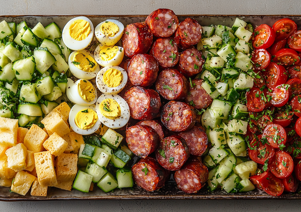 Подготовьте: яйца, сыр, огурец, помидоры, копченую колбасу и зелень для украшения. Идеальные пропорции для гастрономического удовольствия!