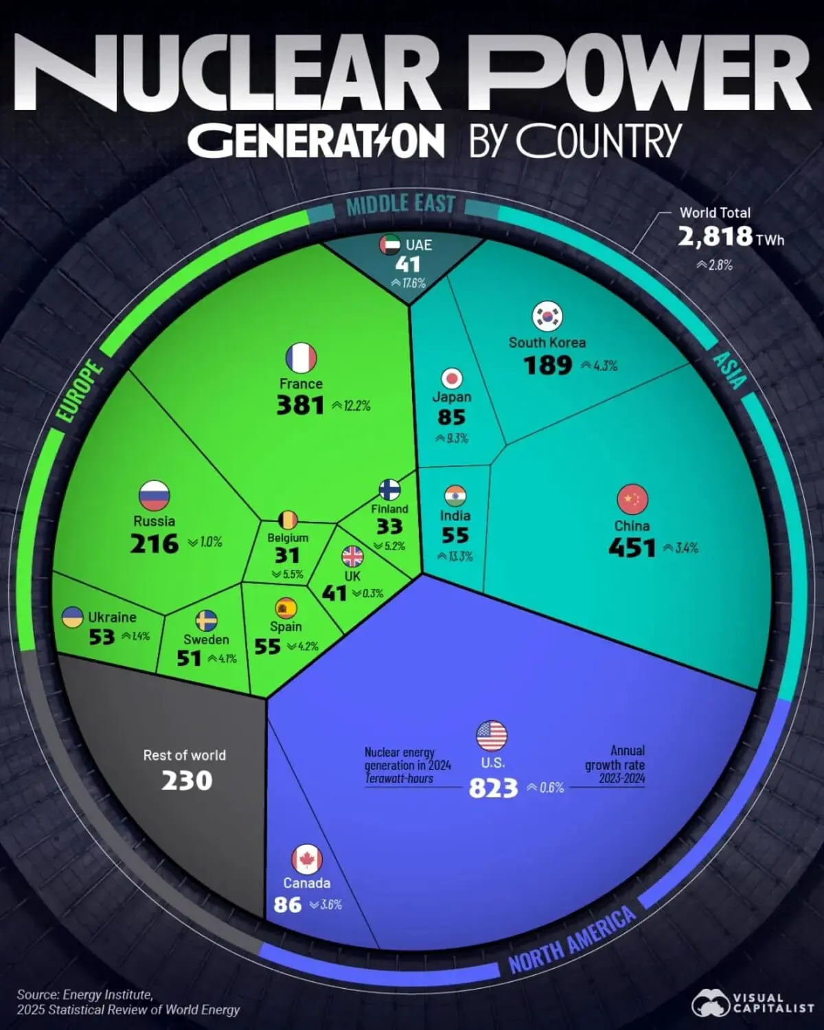 Особого внимания заслуживает Франция, где атомные электростанции обеспечивают более 60% национального энергобаланса. В 2024 году французская ядерная индустрия установила рекорд по приросту производства среди ведущих стран — рост превысил 12%, что совпало с программой обновления и оптимизации реакторного парка.